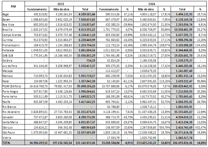 No tocante à execução orçamentária, em 2024, foi empenhado o montante de R$ 347. 347.062 (trezentos e quarenta e sete milhões, trezentos e quarenta mil e sessenta e dois reais), que corresponde a 98,5% da dotação total (levando em conta que da dotação total. Em relação às despesas de capital, foi empenhado o valor de R$ 6.046.685 (seis milhões, quarenta e seis mil e seiscentos e oitenta e cinco reais). Esse valor engloba os dispêndios com a execução de obras - construção da sede da Procuradoria de Justiça Militar em Bagé/RS – PJM/BG - e de reformas estruturais, bem como a aquisição de mobiliário, instalações, material bibliográfico, softwares, equipamentos e materiais permanentes.