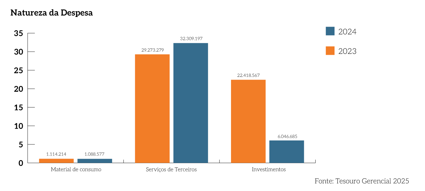 No que se refere aos investimentos, os gastos foram menores que os do exercício anterior na ordem de 73%. Ocorre que em 2023, iniciou-se a construção da PJM/BG e, consequentemente, acarretou um montante mais elevado a ser empenhado na ação.