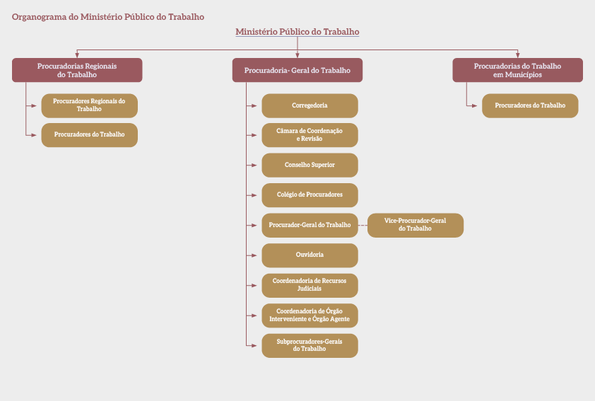 O Ministério Público do Trabalho (MPT) está presente em todo território nacional e estruturado em Procuradoria-Geral do Trabalho (PGT), 24 Procuradorias Regionais do Trabalho (PRTs) e 100 Procuradorias do Trabalho nos Municípios (PTMs).